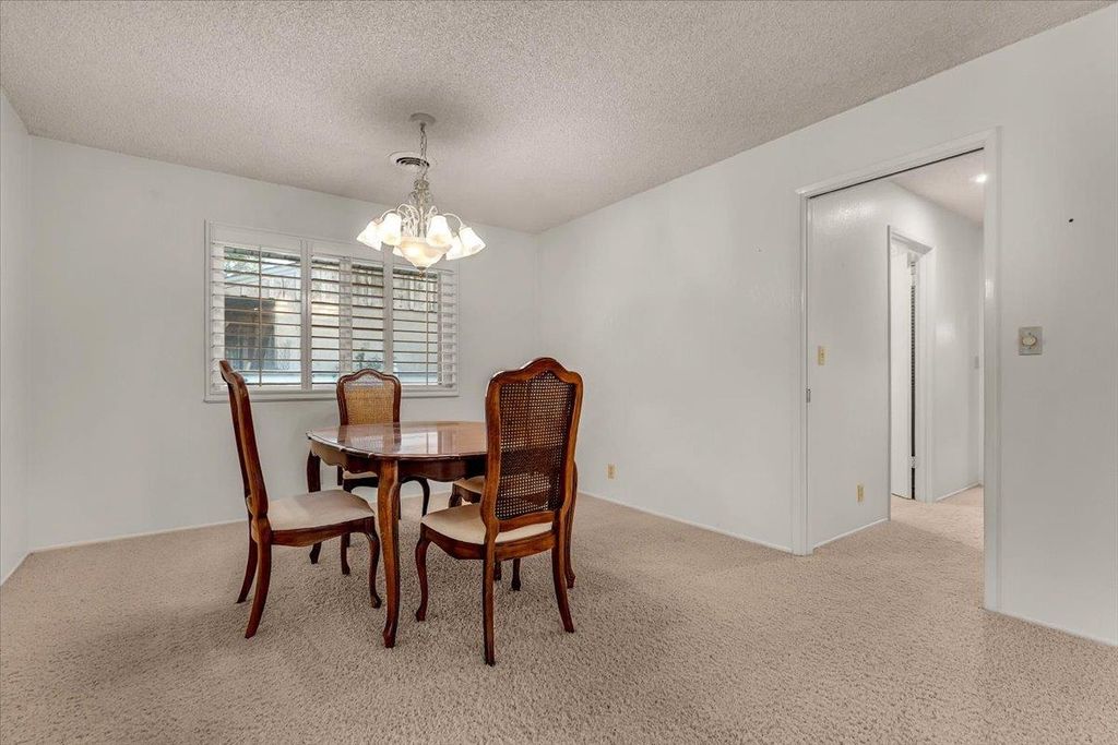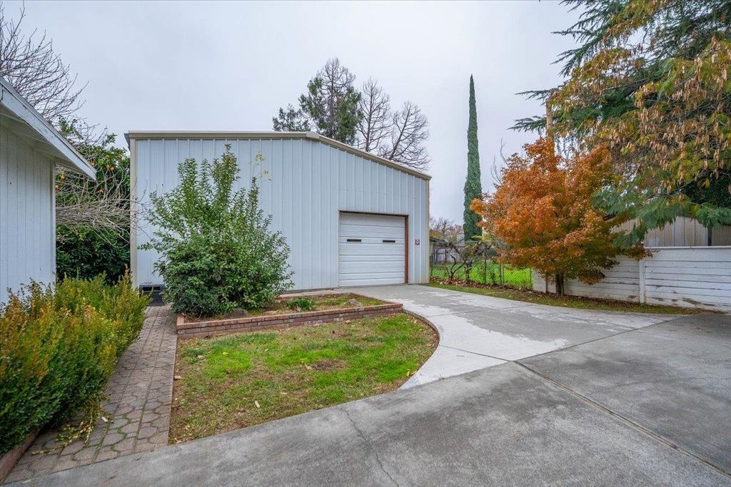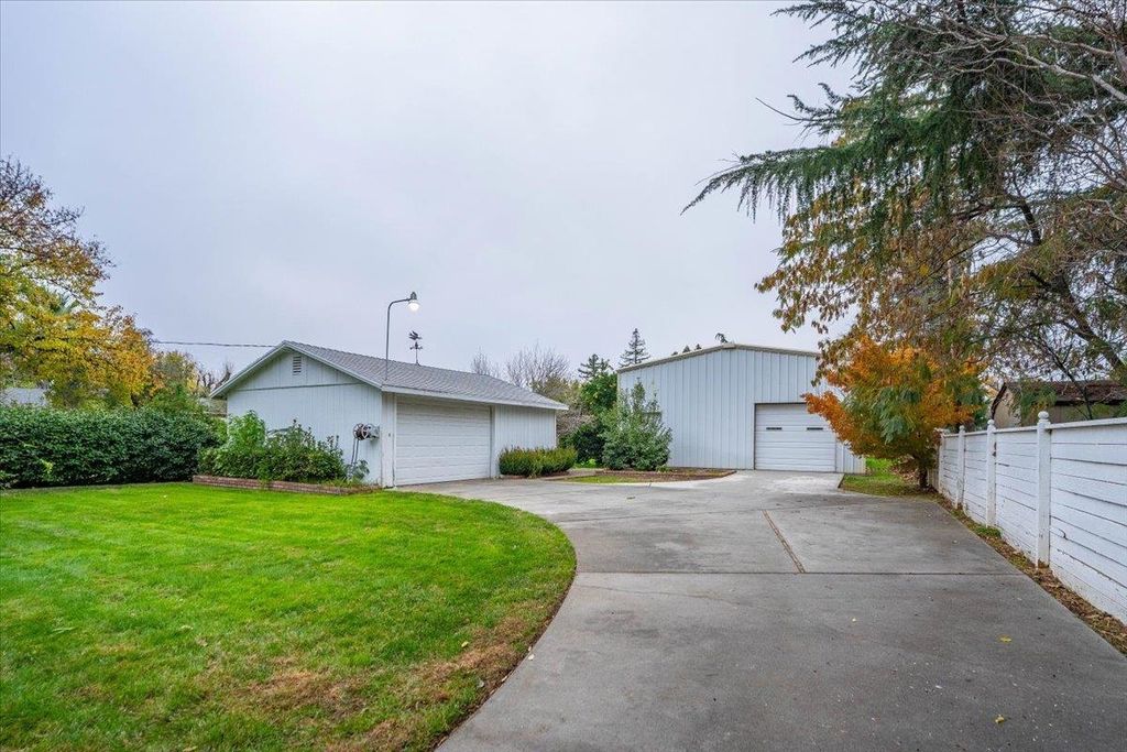 Updated home on nearly 1/2 acre offering 1808 s.f., 2 bedrooms, 2 baths, living & family rooms. Bright kitchen with breakfast bar, and a pantry offering area for extra refrigerator & freezer. Family room features plantation shutters and slider that opens to a tiled courtyard style patio, creating a welcoming outdoor living area perfect for morning coffee or evening gatherings. Large primary bedroom offers abundant storage, a walk-in closet, and an ensuite bath with a relaxing jetted tub. The second bedroom is quaint and inviting with built-in bookshelves, a desk area, and French doors leading to a private deck overlooking the backyard. Outside is a detached 2 car garage with storage cabinets. There is also a metal shop with 2 large roll up doors. So much usable space inside and out!